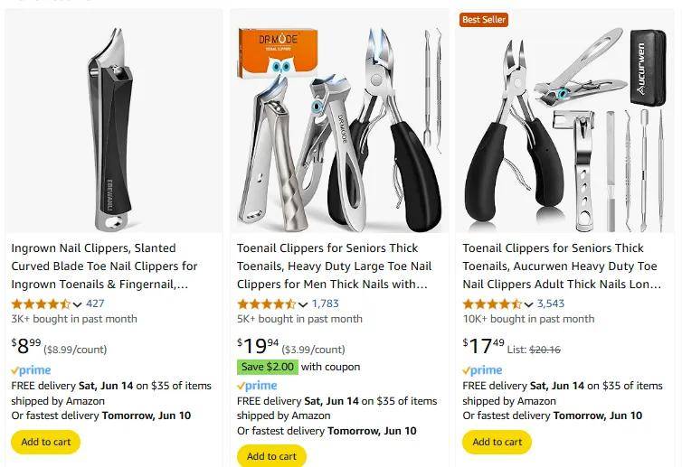 亚马逊美国站数据显示,售价为8.99美元的单个鹰嘴指甲刀上个月销量达3000+单;售价为19.94美元的鹰嘴指甲刀套装上个月卖出5000+单;来自Aucurwen店铺售价17.49美元的老年人厚趾甲钳上个月销量超10000+单,抢占该类目畅销榜。