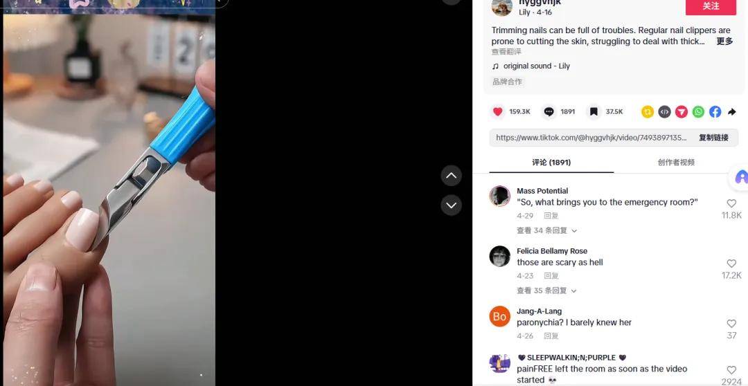 从评论区中可以看出,TikTok上许多用户正在备受修剪指甲的困扰,长指甲勾进皮肤里带给人们太多恐惧,大家都表示需要一个祛除指甲问题的工具。